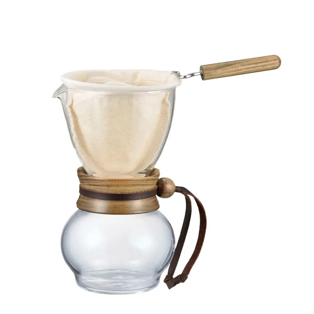 まず、ネルフィルターはペーパーフィルターのように自立させることができません。そこでドリッパーを使う代わりに、輪のついたハンドルにネルフィルターをかけて使います。
