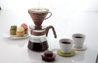 深煎りの豆は水分が抜けやすく、軽くなりがちなので計量スプーンを使う場合は、やや山盛りにして入れると、ちょうどいい量になります。アイスコーヒー用に抽出する時は、氷で薄めることを想定して抽出します。抽出時はホットコーヒーの2倍の濃度になっているのが理想です。今回は計量スプーン2杯分の粉(20〜25g)なので、抽出する量は1杯分(150cc)。