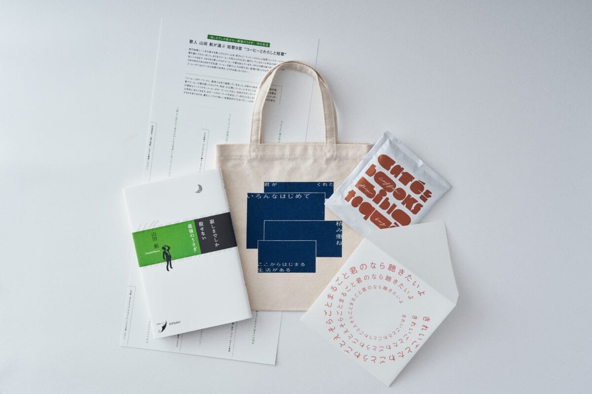 新作歌集のなかからピックアップした短歌をデザインしたトートバッグのほか、コーヒータイムが楽しくなるような短歌ドリップコーヒーを販売。また、フェアを記念して山田航が選歌したコーヒーにまつわる短歌9首を“飾れる”フリーペーパーとして配布されます。