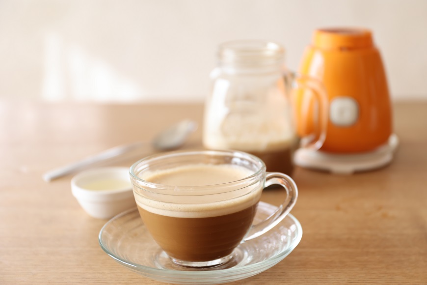 「ギー」特有のクセのある風味を緩和して、よりおいしくバターコーヒーを楽しむための独自配合。さらに「ギー」が低温になると固まってしまい使いづらい、という問題を解決するために、独自の攪拌技術で製造し、低温でも固まらない仕上がりに。