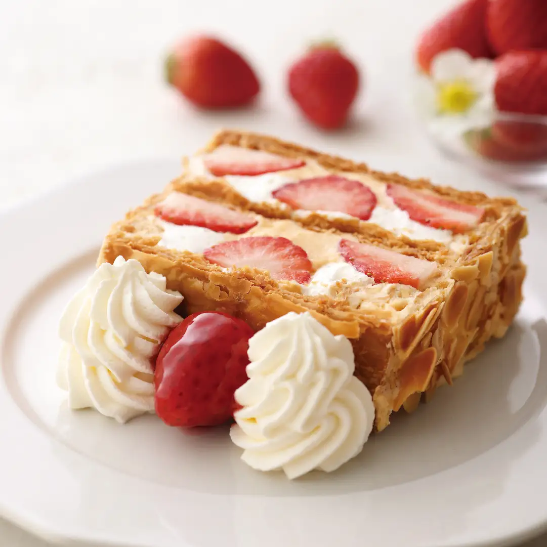サクサクのパイ生地とクリームを何層にも重ね、真っ赤な苺を贅沢にあしらったフランス菓子“苺のミルフィーユ”は、日本では『ナポレオンパイ』と称され、多くの方から愛されています。
