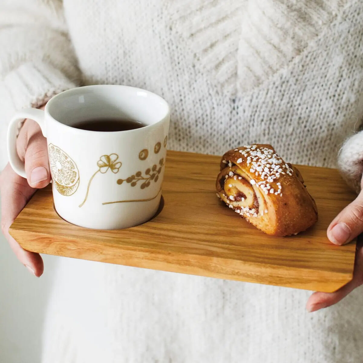 フィンランドのコーヒー休憩「カハヴィタウコ」を楽しむのにぴったりのマグ&トレイのセットです。マグは豊かな実りをデザインしたテキスタイル、トレイは丈夫で手ざわりのよい国産の桜材で作られています。いつもの朝食やお茶の時間をより味わい深くします。