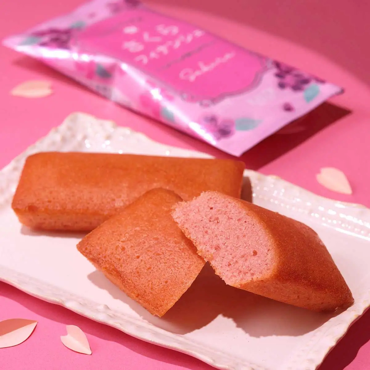 しっとりと焼き上げた、さくら香るフィナンシェです。ホワイトチョコレートを生地に混ぜ合わせたミルキーな味わいに、さくらの華やかな香りが良く合います。