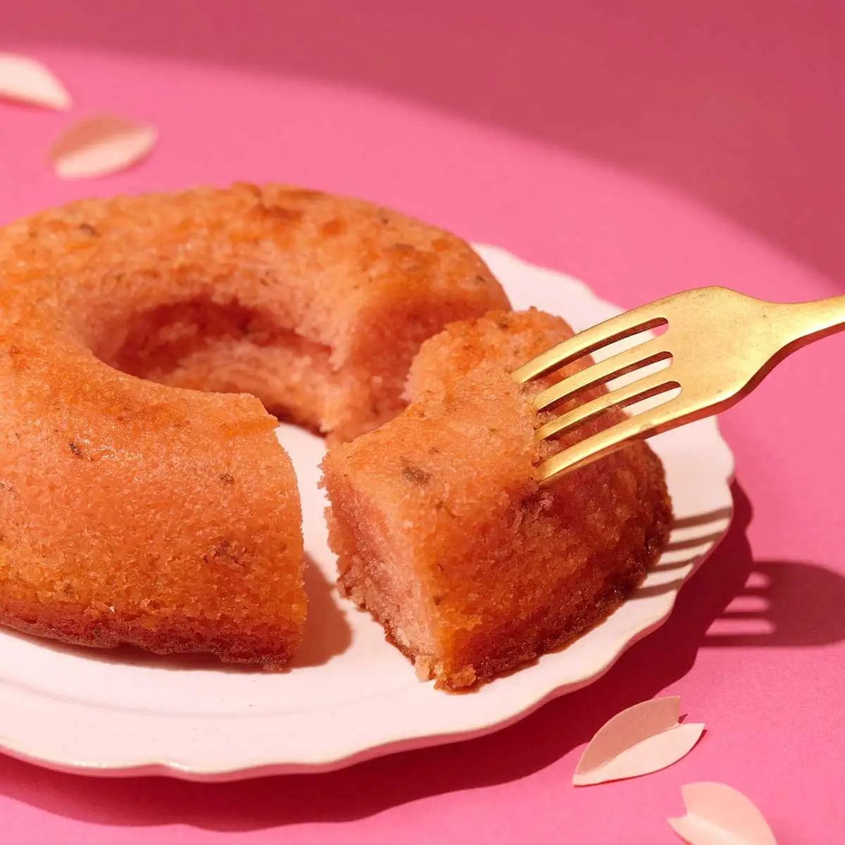 さくらが上品に香る、しっとり食感の焼きドーナツです。北海道産小麦の優しい甘みが感じられる生地に、桜花と桜葉の風味を合わせました。