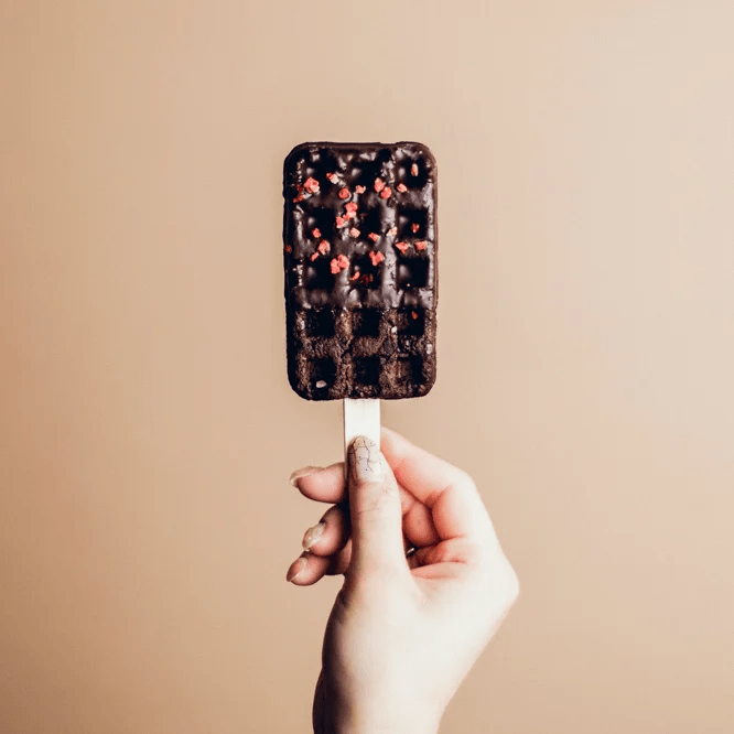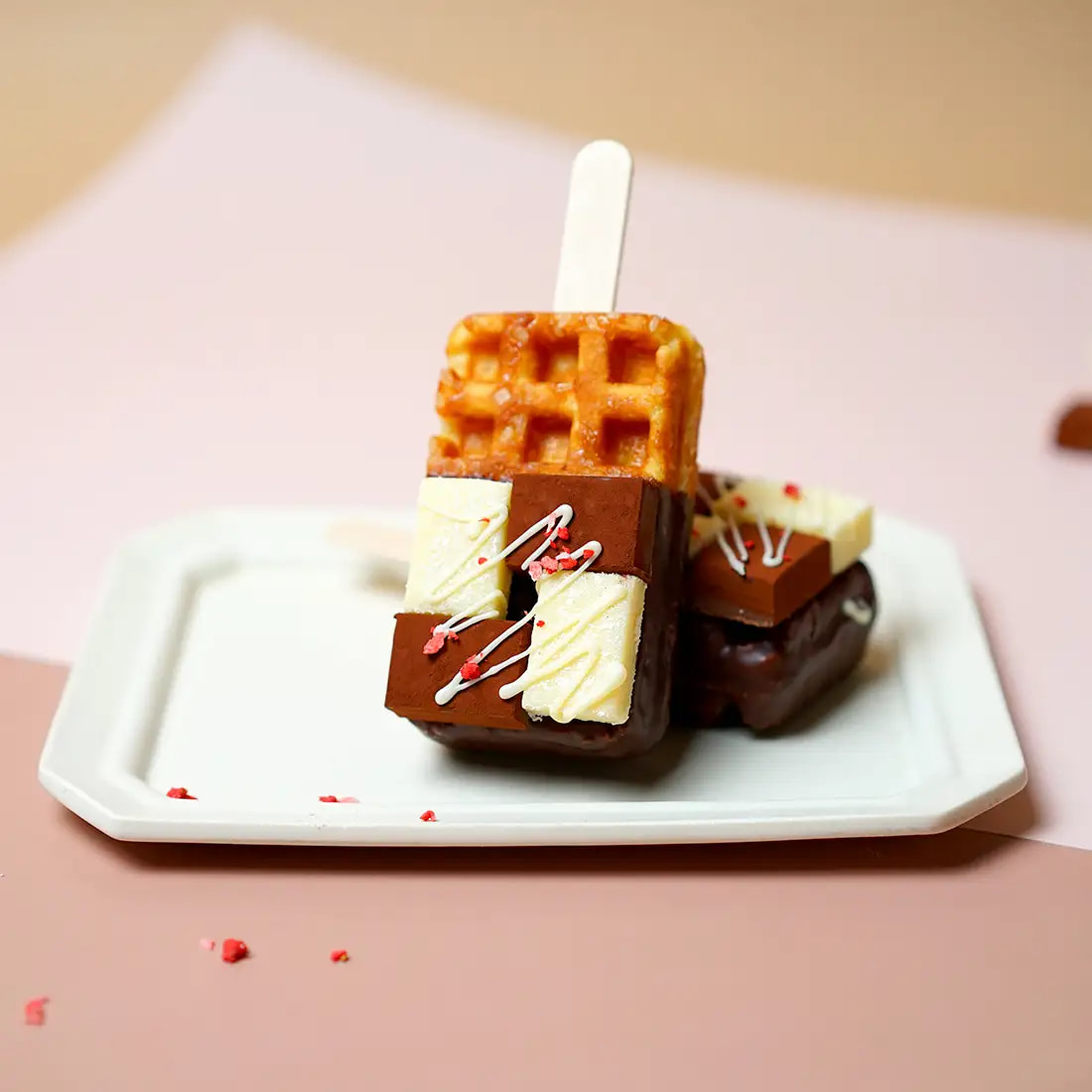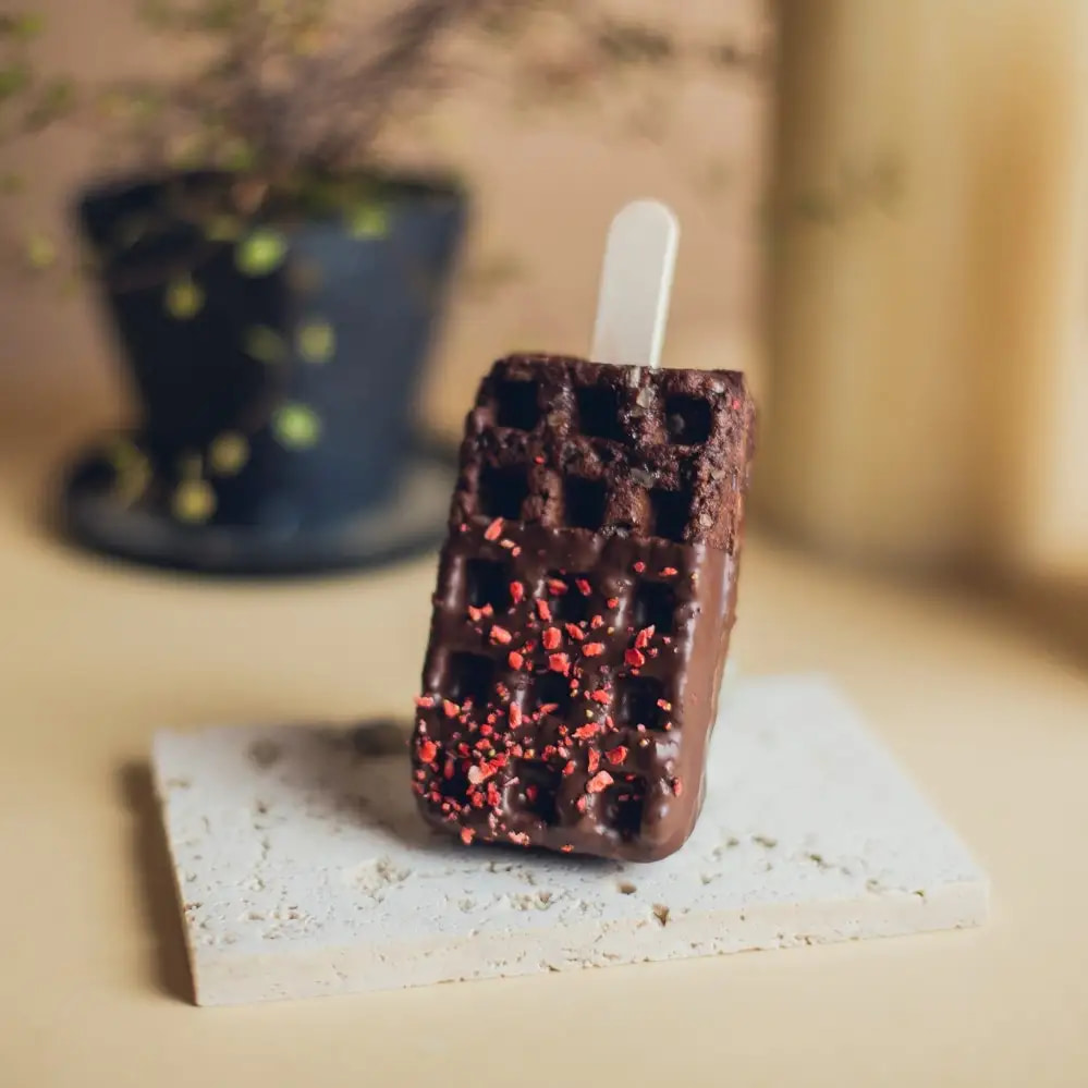 ほろ苦いココア生地のワッフルとチョコレートの相性は抜群。程よい甘さが癖になる限定フレーバーです。コーヒーや紅茶などのドリンクと一緒にお楽しみください。