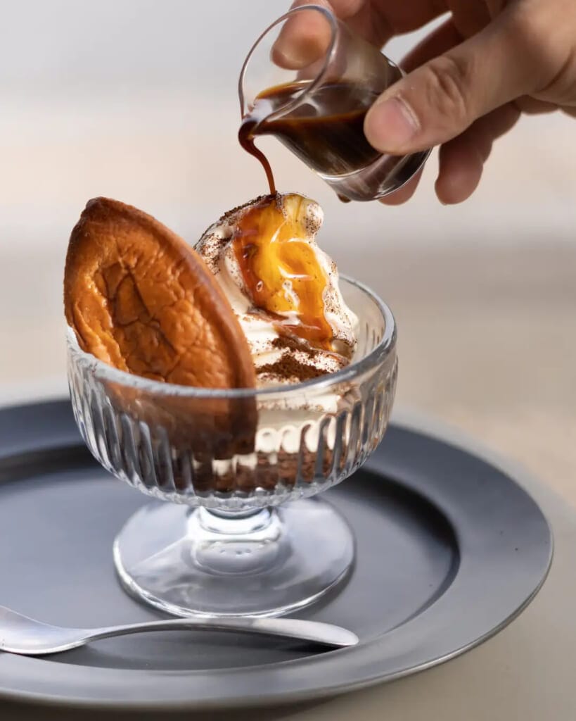 今回ご提供する「ハーバーアフォガート」は、軽く、フルーティーな味わいが特徴の UNI COFFEE ROASTERY のコーヒーに、ありあけハーバーを浸して、オーブンで焼き、バニラアイスクリームを添えたもの。
