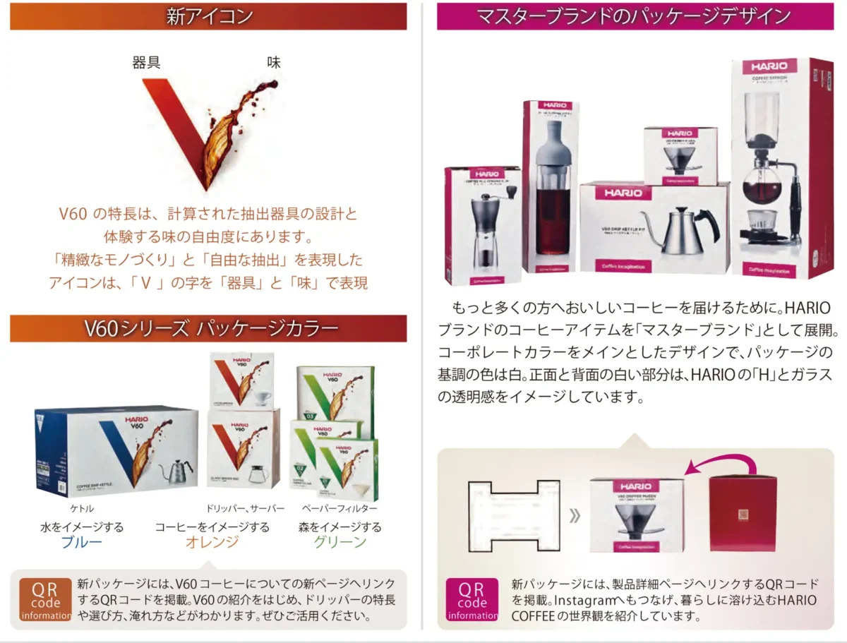 コーヒーアイテムを「V60ブランド」と「マスターブランド」に分け、それぞれが持つ特長や魅力を明確に、そしてグローバルにコーヒーカルチャーを伝えていくために、パッケージを変更してアイコンも刷新。ブランド始動当初から愛されているコーヒーアイテムも、スタイリッシュにアップデート。「コーヒーをコミュニケーションの始まりに」をテーマに、ユーザーとのタッチポイントを広げるためQRコードから情報提供の場へとつなぎます。