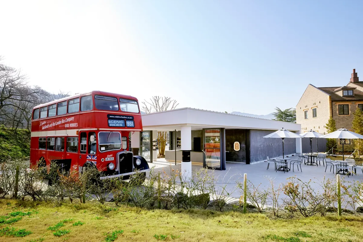 〝最⾼のティータイム〟 バラや四季折々の花と草⽊を楽しめるイングリッシュガーデンに併設した店舗では、弊社が独占契約した紅茶の本場イギリスのティーハウス<ファーラーズ Farrerʼs>の紅茶と、オリジナルレシピのスコーンをはじめ、季節や花をテーマにした焼き菓⼦をお楽しみいただけます。また、イギリスで実際に使⽤されていた2階建てのロンドンバス(※)も客席としてご利⽤いただくことができます。
