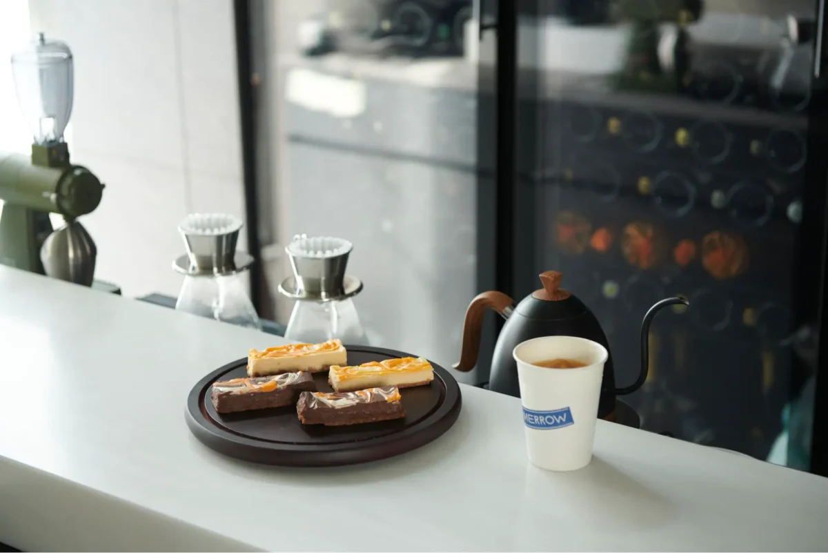 ギャラリーのウェブサイトと戸田氏の作品の色からイメージを抽出したチーズケーキ、バリスタの田部堅太が展示や季節に因んだコーヒー豆を選定したコーヒーをお楽しみいただけます。