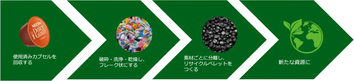 このたび開始する「ネスカフェ ドルチェ グスト リサイクルプログラム」は、カプセル式コーヒーメーカー「ネスカフェ ドルチェ グスト」の使用済みカプセルを回収し、プラスチックを資源としてリサイクルする取り組みです。今回の試みでは、明るい未来のために出来ることの環境貢献アクションを推進する株式会社イトーヨーカ堂にご協力いただき、ネスレ日本および「ネスカフェ ドルチェ グスト」としては初となるスーパーマーケットの店頭でのカプセル回収活動を行います。回収されたカプセルは、リサイクルのための処理を経てペレットに成形した後、新たな資源に生まれ変わります。
