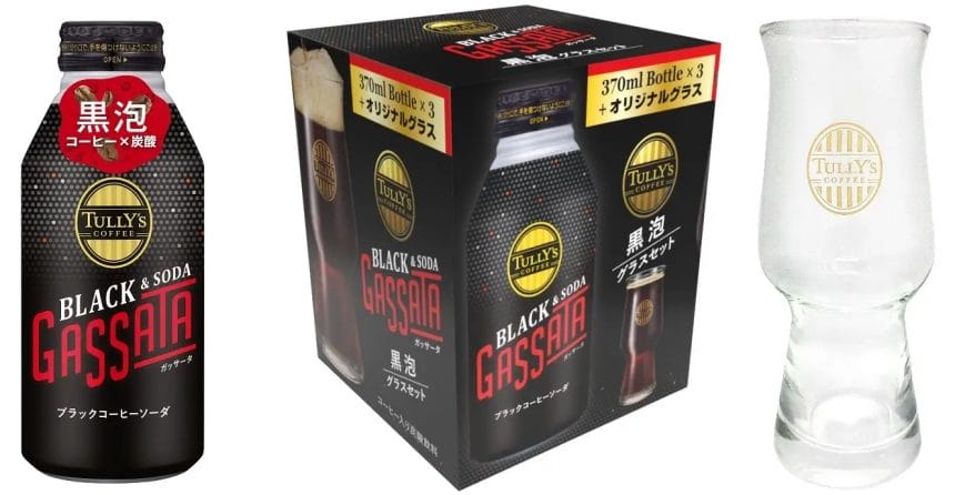 「TULLY’S COFFEE BLACK&SODA GASSATA」370mlボトル缶を3本に、ご家庭でも手軽に『黒泡』を体験していただけるオリジナル「黒泡グラス」1個がセットになっています。