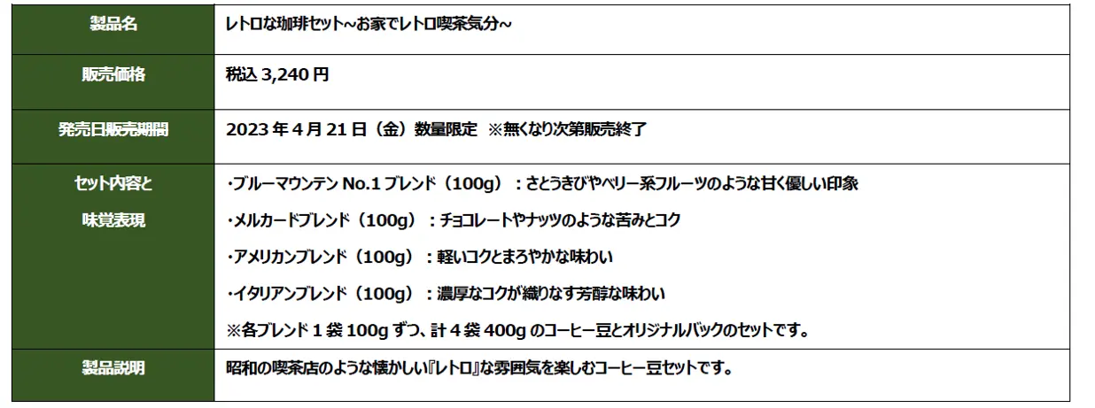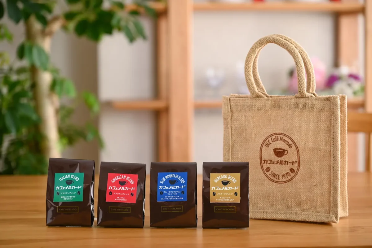 UCCは今年で創業90周年を迎えます。1970年より展開をし始めたのが「UCCカフェメルカード」でした。喫茶店でコーヒーを飲む文化が根強かった当時​、UCCは「一人でも多くのお客さまへおいしいコーヒーをお届けしたい」という思いのもと、喫茶店にコーヒー豆の挽き売り業態を併設した「UCCカフェメルカード」を全国に展開しました。そして2023年現在に至るまで50年余りにわたり、お客さまにおいしいコーヒーをお届けし続けています。今回は長年ご愛顧いただいている皆さまに感謝の気持ちを込め、開業当初1970年代の面影を感じていただける昭和の喫茶店のような懐かしい「レトロ」な雰囲気を、ご自宅でもお楽しみいただけるよう、4種類のコーヒー豆(ブルーマウンテンNo.1ブレンド・メルカードブレンド・アメリカンブレンド・イタリアンブレンド各100gずつ)を、オリジナルのバックとともに販売します。また、​併設の喫茶コーナーでは純喫茶ならではの『ちょっとレトロなメニュー』をご用意しています。
