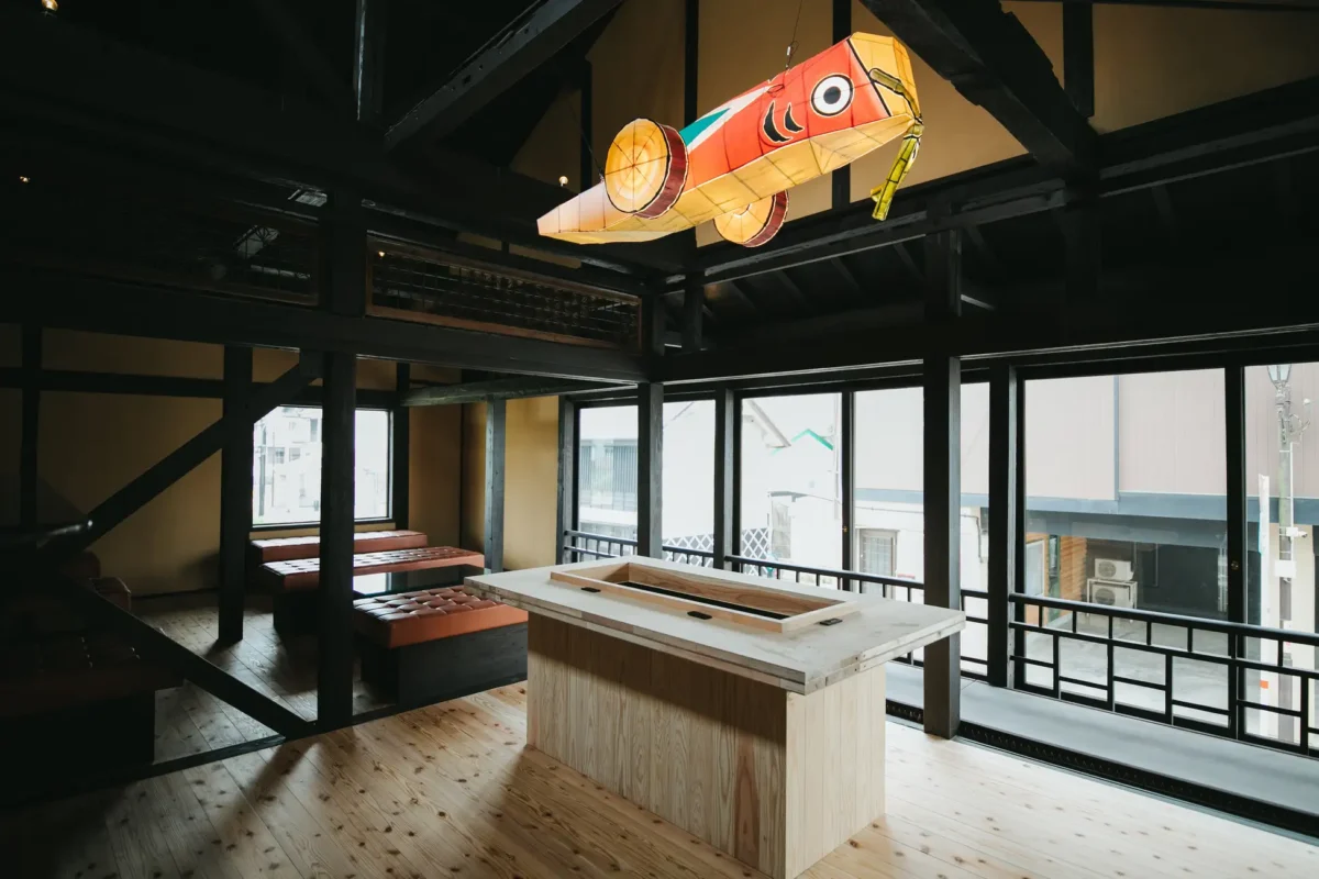 古き良き町並みに馴染む、和風建築の美しさを際立たせた外観。梁や欄間には、もともと使われていた古材を活用し、町の歴史を五感で体感できる心地よい空間が完成しました。