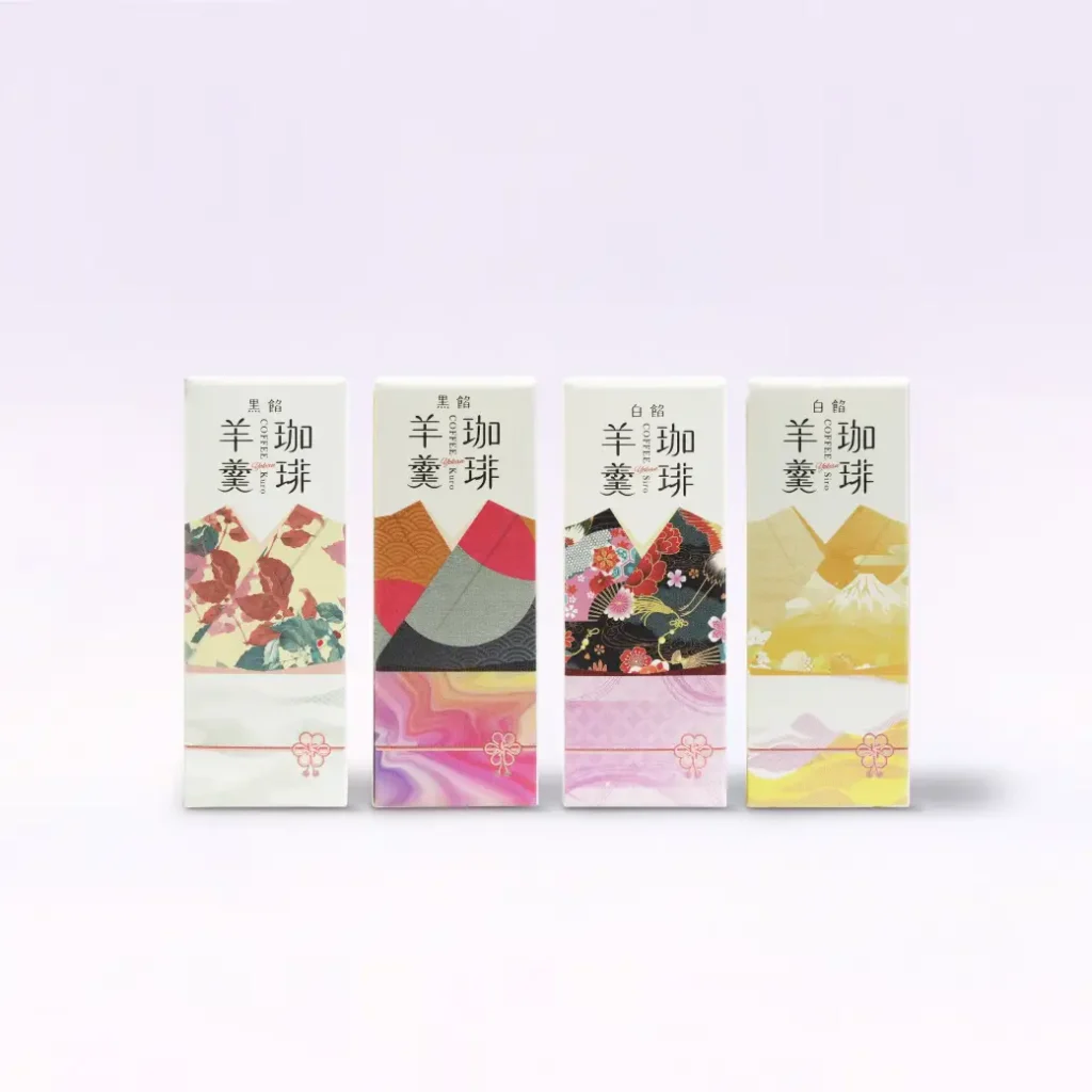 パッケージはカラフルで華やかな着物柄をあしらい、モダンな和風テイストに。珈琲羊羹の黒餡・白餡、紅茶羊羹の全3種、各パッケージの表面と裏面で異なるデザインがお楽しみいただけます。海外観光客のお土産やちょっとした贈り物にもおすすめです。