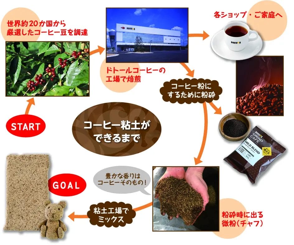 コーヒー粘土は「子どもが楽しく、食のリサイクルについて学べる」をテーマに、ドトールコーヒーの取り組み・活動によって作られました。大人が嗜む飲食の象徴でもあるコーヒーと、子どもたちが大好きな粘土のコラボレーションが実現しました。