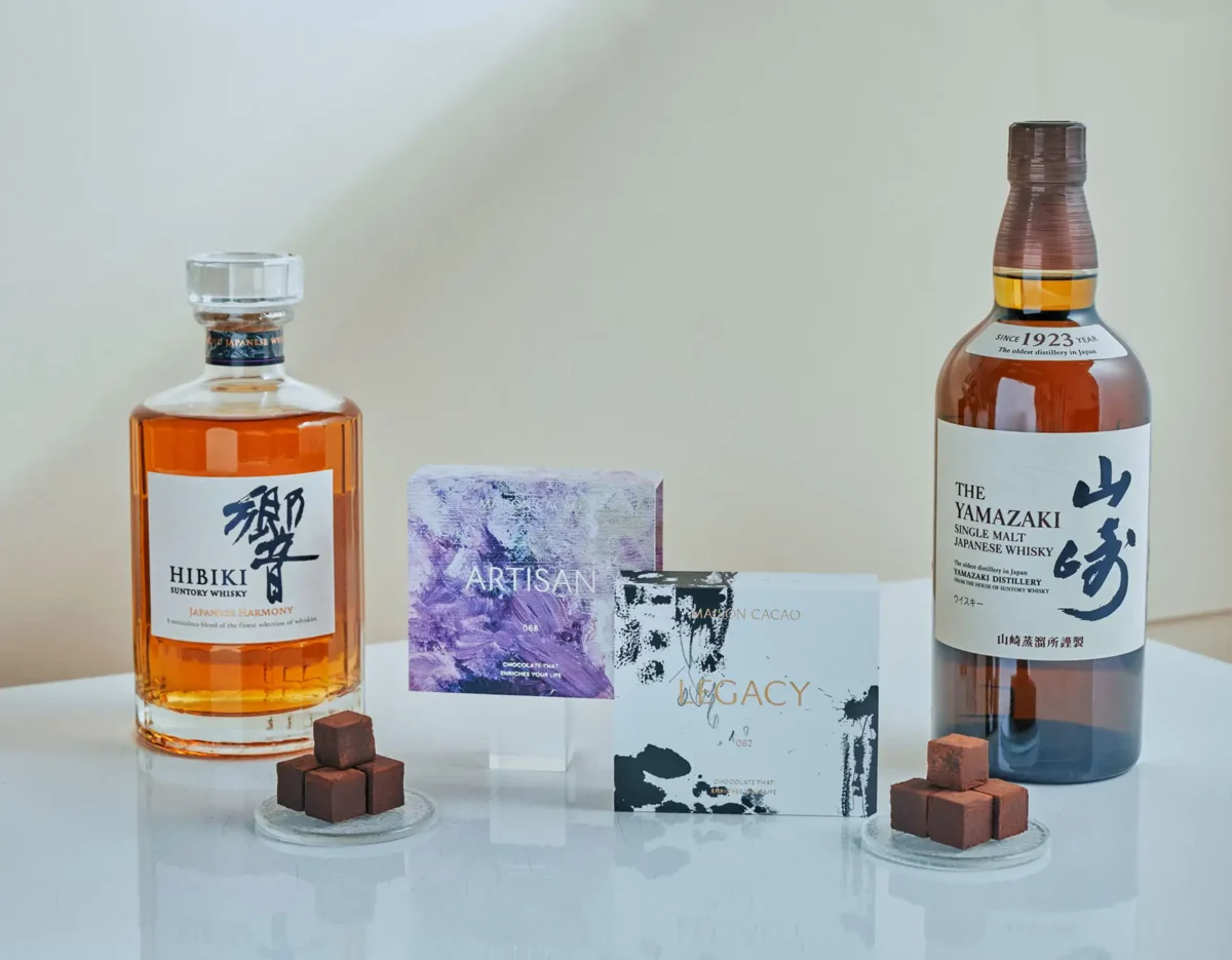 ナッツの風味とスパイス僅かなカカオの渋みを表現した力強いミルクチョコレートをベースに花開く香味で愛されるサントリーウイスキー響 JAPANESE HARMONYを合わせました口に入れた瞬間のウイスキーの香りまろやかに広がる余韻をお楽しみください