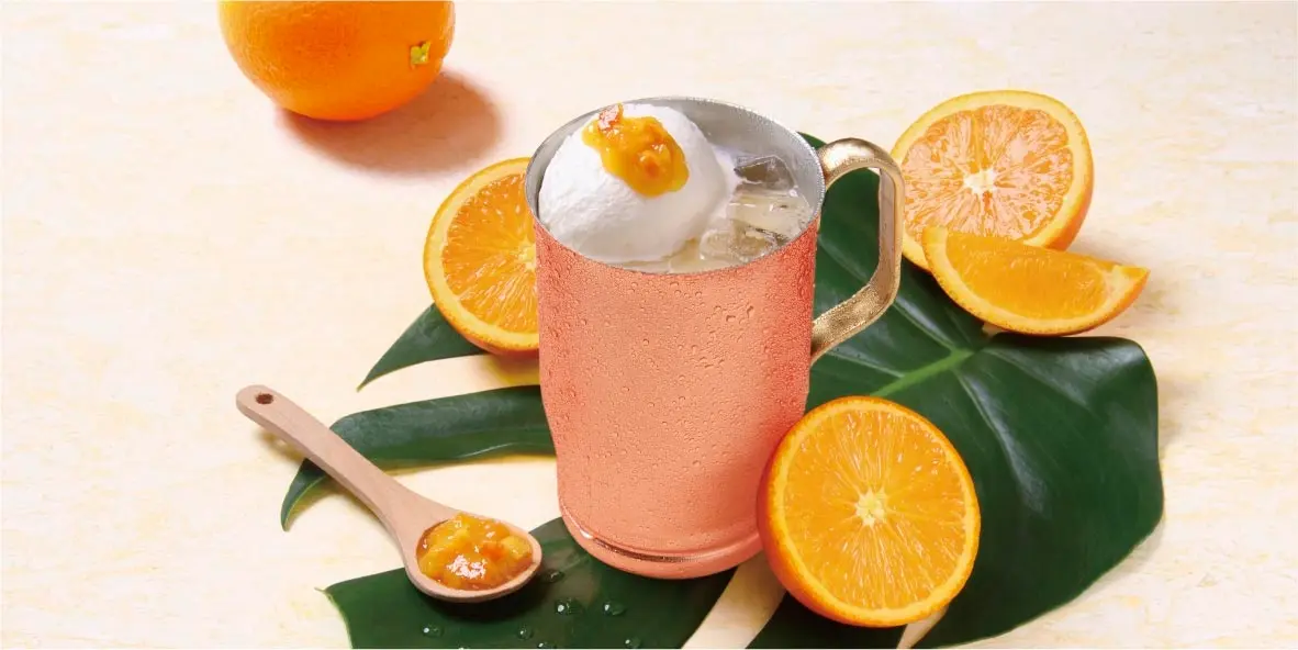 上島珈琲店のシーズナル限定ミルク珈琲の中でも歴代人気No.1の『オレンジミルク珈琲』が今年も登場します。「バレンシアオレンジ」の果汁をたっぷりと使用した上島珈琲店オリジナルシロップを「ミルク珈琲」に合わせて、大人の贅沢なミルク珈琲に仕上げています。トッピングのオレンジコンポートには、オレンジを皮ごと使用しており、ほろ苦く甘酸っぱい風味が絶妙なアクセントとなっています。味だけではなく、見た目も華やかで食感もお楽しみいただける、ワクワク感が詰まった贅沢な一杯をお楽しみください。