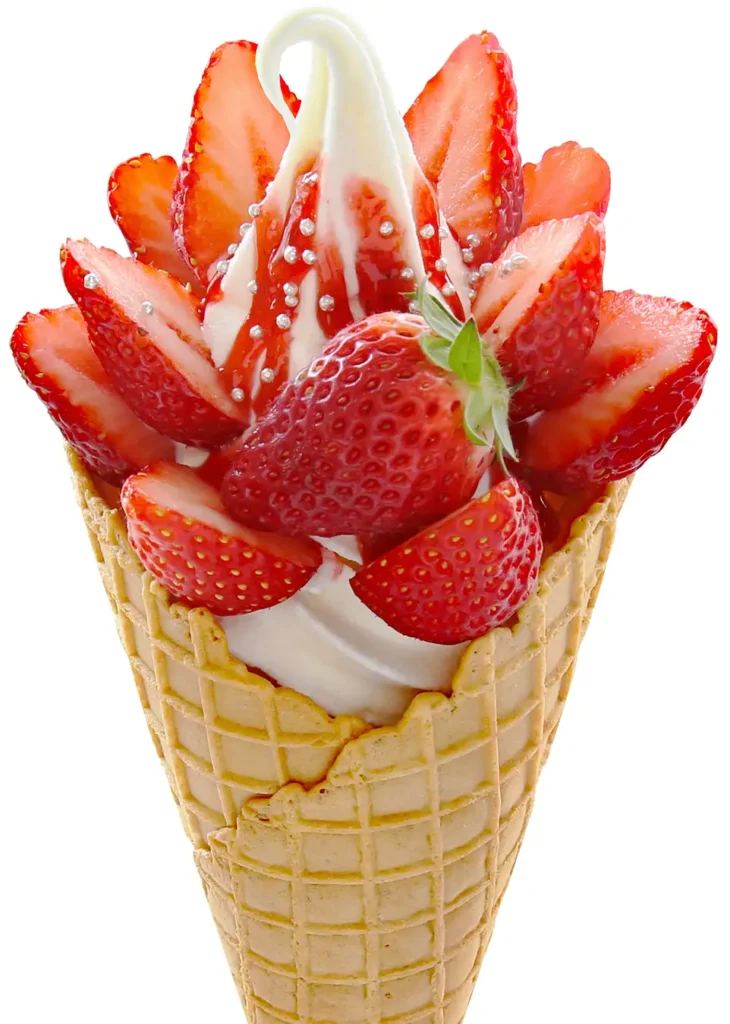 バニラソフトにいちご果肉ソースと千葉県産のいちごをてんこ盛り