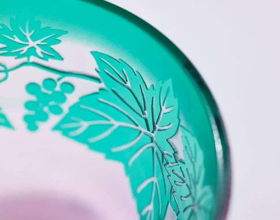 工房を代表する「彫刻硝子」は、二層、三層のオリジナル色被せガラスをひとつひとつ手吹きした器へ、鉄線や葡萄などの縁起柄をサンドブラストで彫刻し、色のコントラストで表現しています。