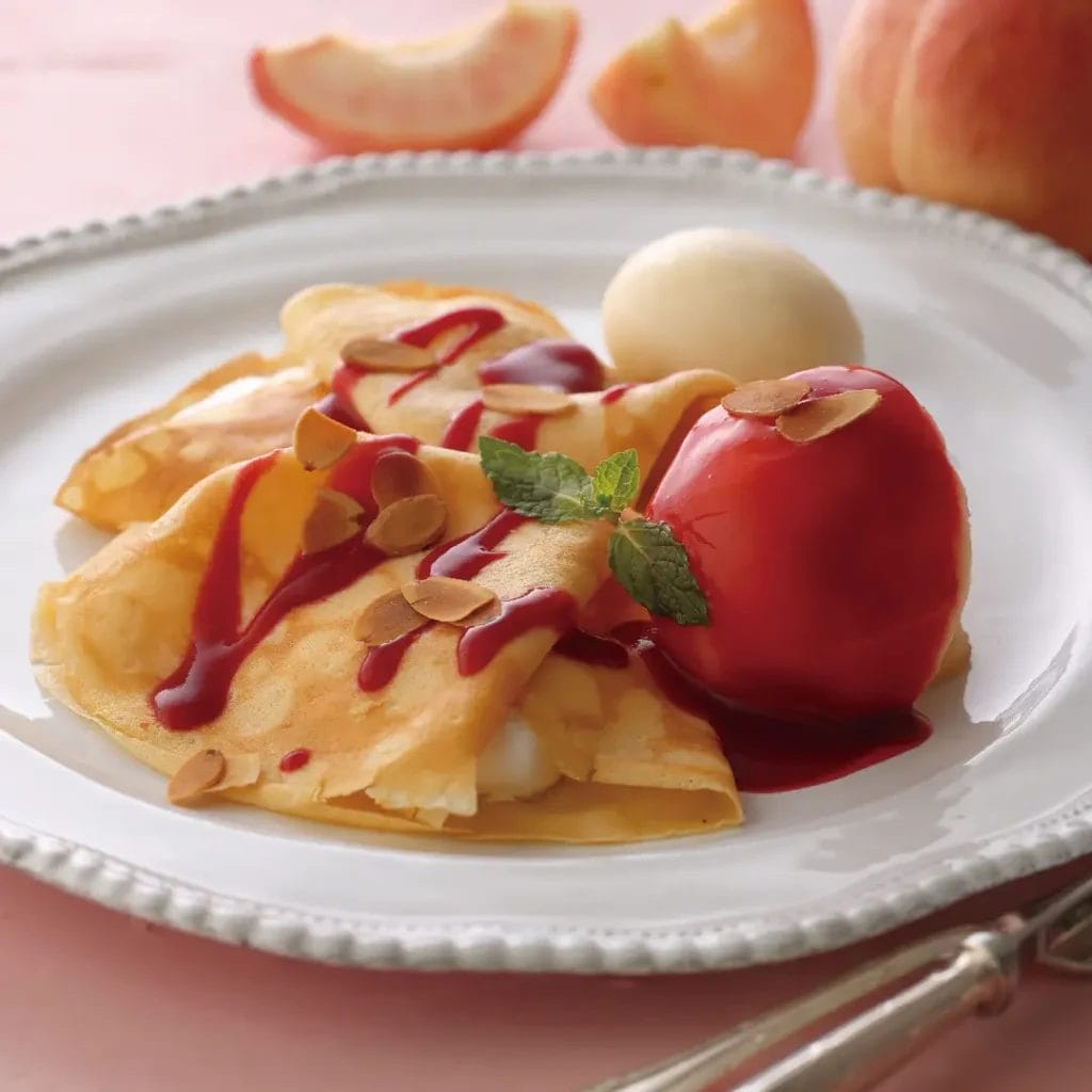 焦がしバターを加えて焼いた自家製クレープに、クレーム・シャンティを包みました。果実本来の美味しさを味わえるよう軽くマリネしたフレッシュの桃と、フランボワーズソースとご一緒に。