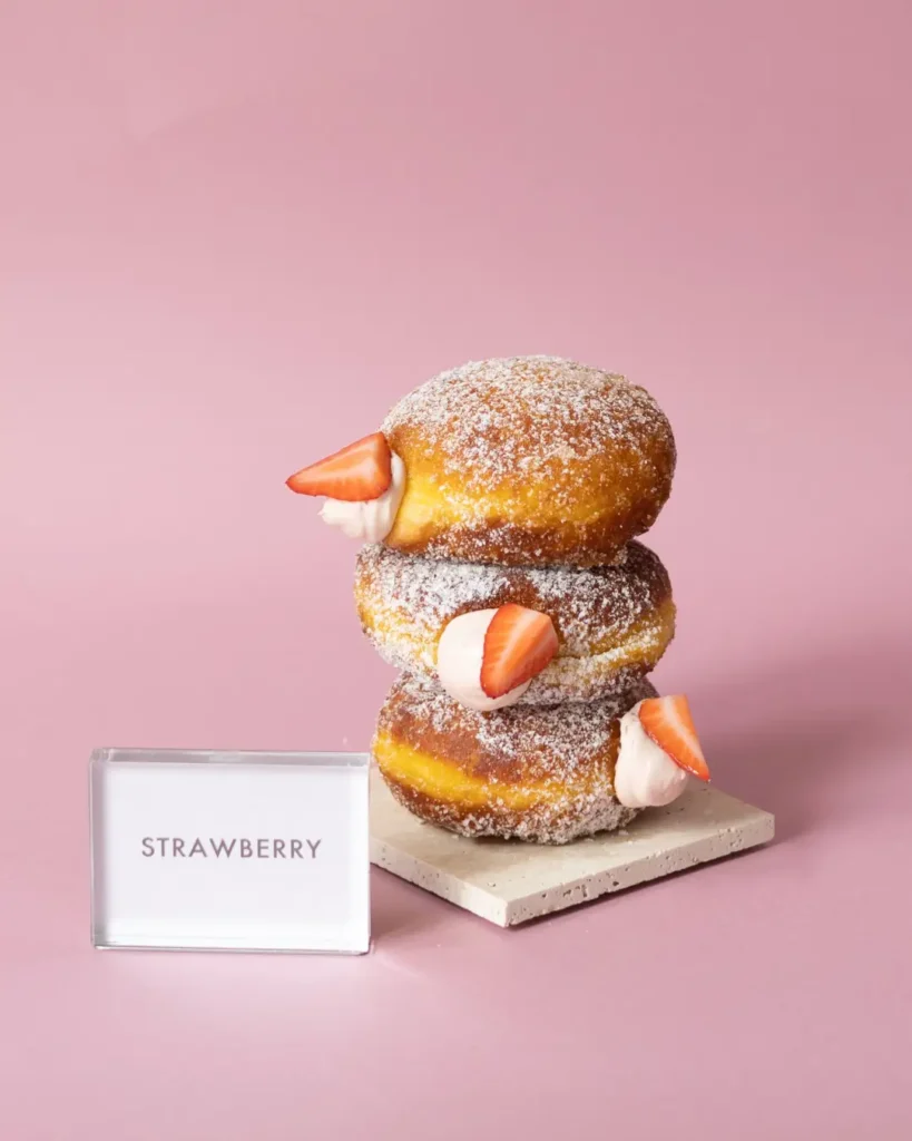 甘酸っぱいいちごをたっぷりと使用した後味さっぱりなクリームを入れた生ドーナツです