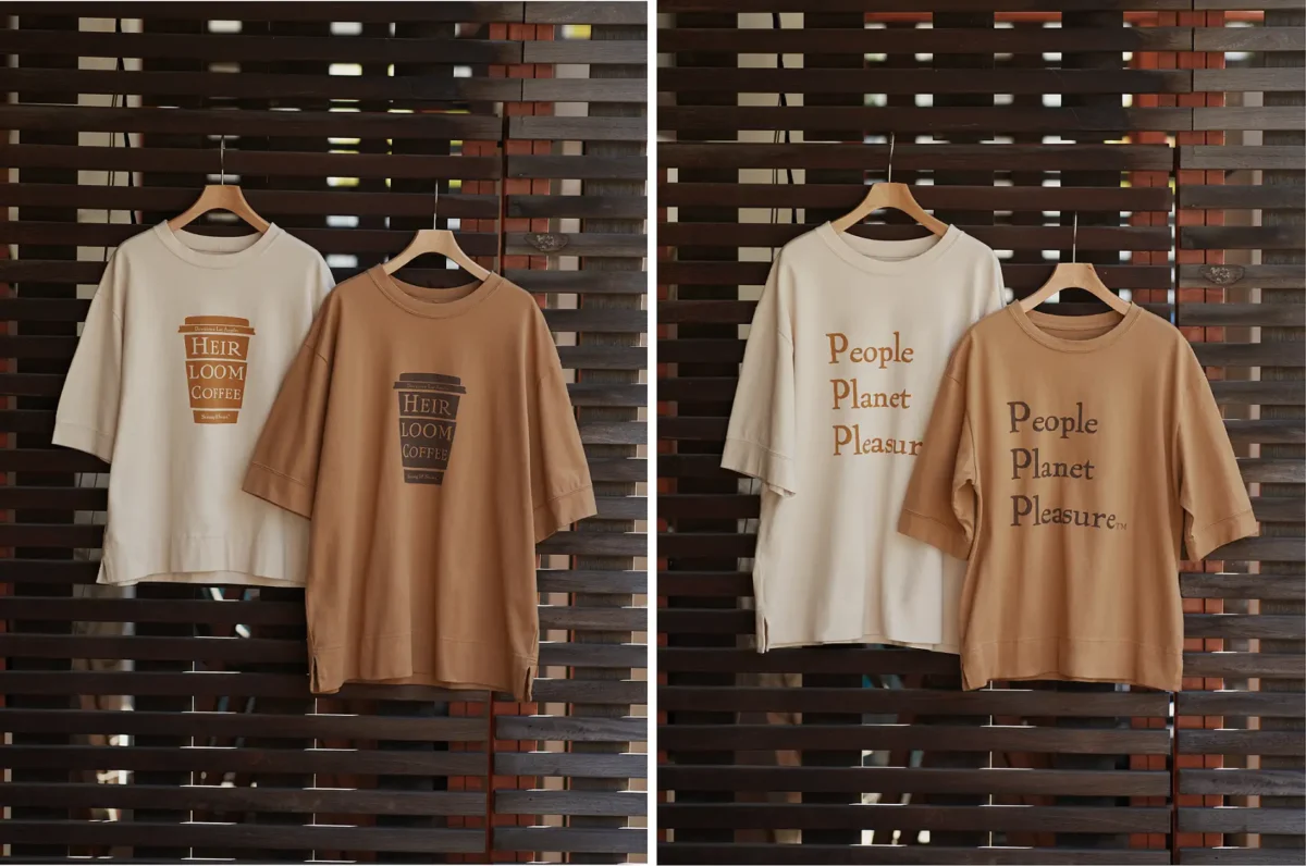 Tシャツはカフェスタッフを意識してレディスとメンズともに着用できるサイズ展開で、LatteとMochaの2色展開。コーヒーかすに含まれる成分を抽出、それを染料にして染め上げています。食品から抽出した天然染料を90%以上使用し、科学染料の使用を最低限に抑えた染料を用いて染した生地になります。