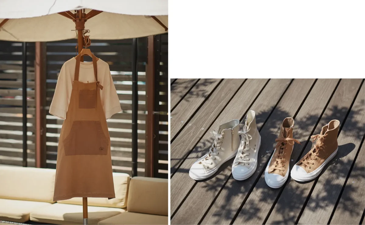 右:同素材のMocha色で作ったハイカットスニーカーは、中敷きにコラボネームのプリント、ベロの裏にはhuman womanの25周年ロゴプリントを、さらには踵にhwの刻印をクリーミーなLatteカラーであしらったデザイン。脇にファスナーあきを作って履きやすさにもこだわりました。