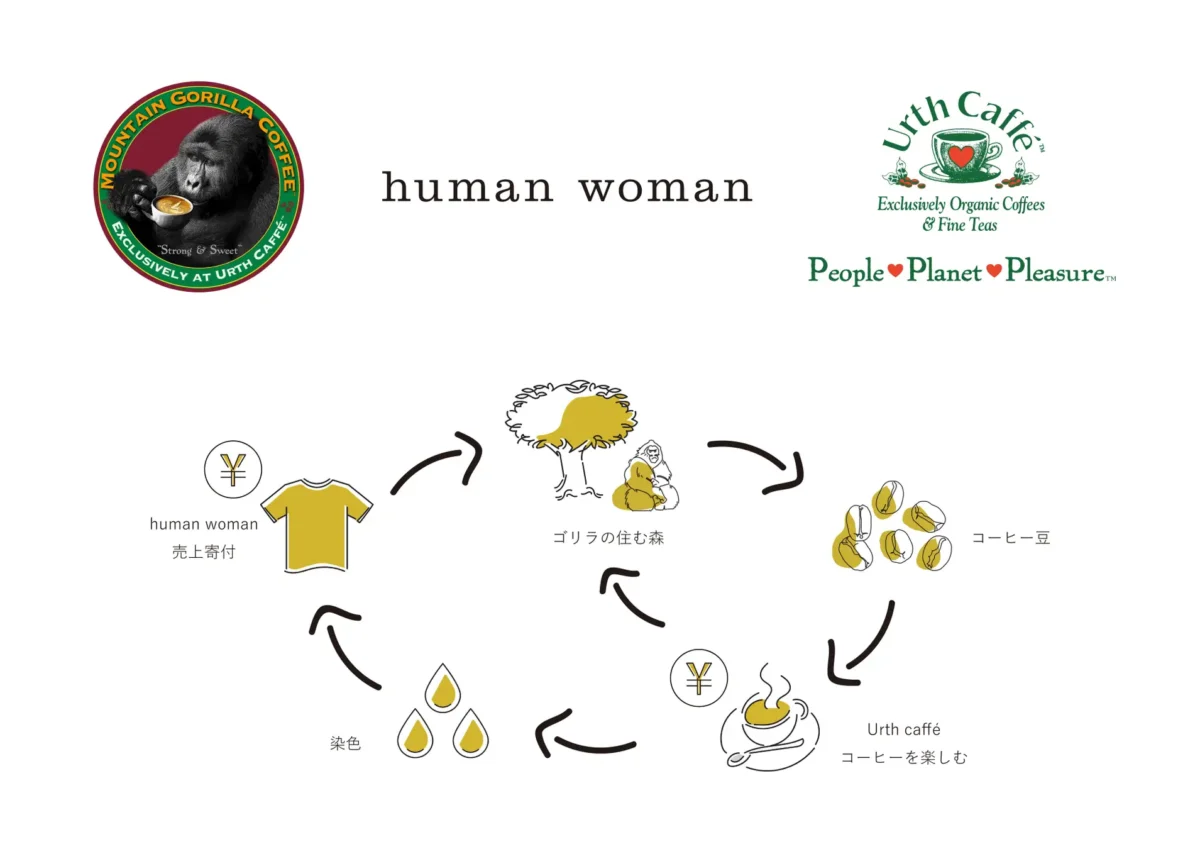 human womanのサスティナブル活動の一つでもあるTSUNAGUプロジェクトの延長でスタート、抽出後のコーヒー粉を使用して染色することにより、廃棄するものを減らすエコな取り組みのアイデアから企画が生まれました。環境への取り組みも積極的に行っているグループ会社のUrth Caffeに、快く賛同をいただきコラボレーションが実現。企画から生産進行の打ち合わせを何度も重ね、様々な人の手が加わり、多くの人に「地球にやさしいファッションを楽しんでもらいたい」という思いを込めて8月4日(金)よりhuman woman全店舗・公式オンラインショップにて販売開始致します。また、Urth Caffe代官山店では、スタッフがTシャツを着用致します。是非お立ち寄りください。