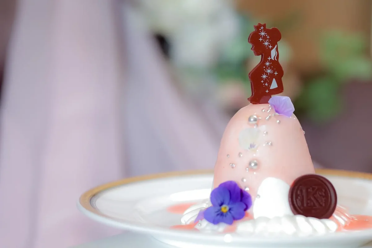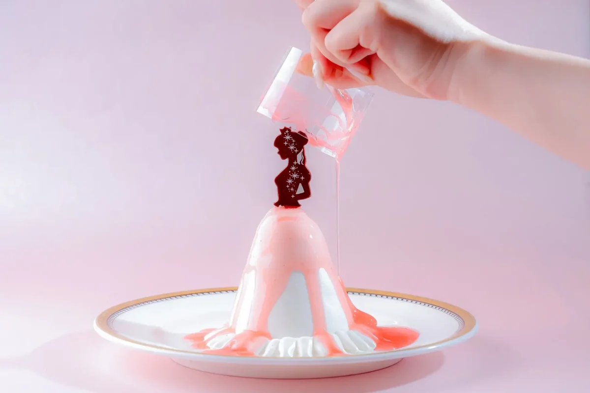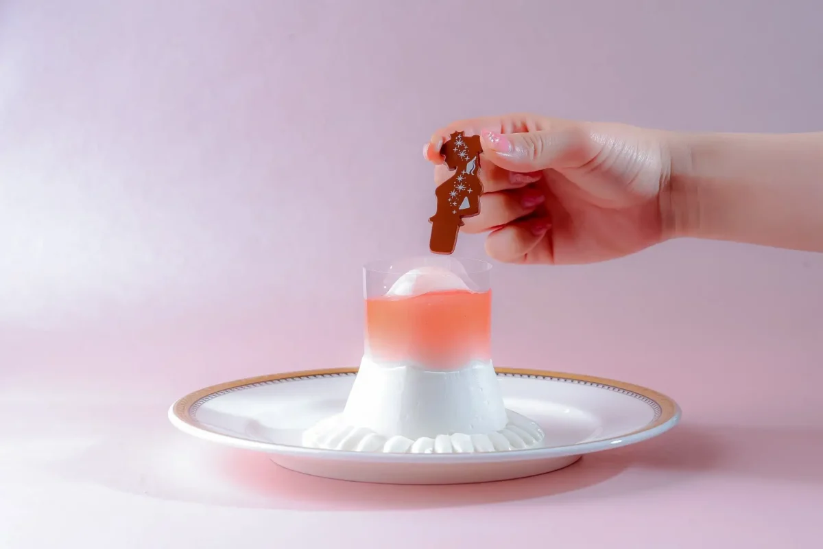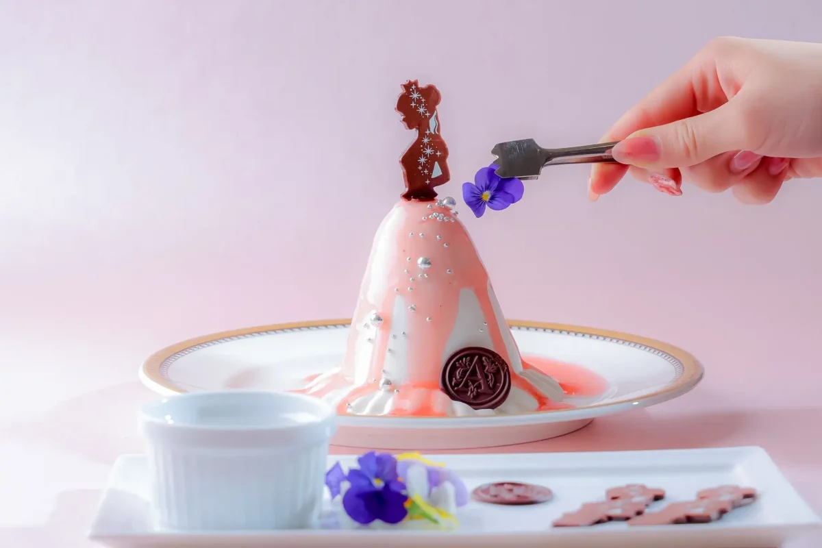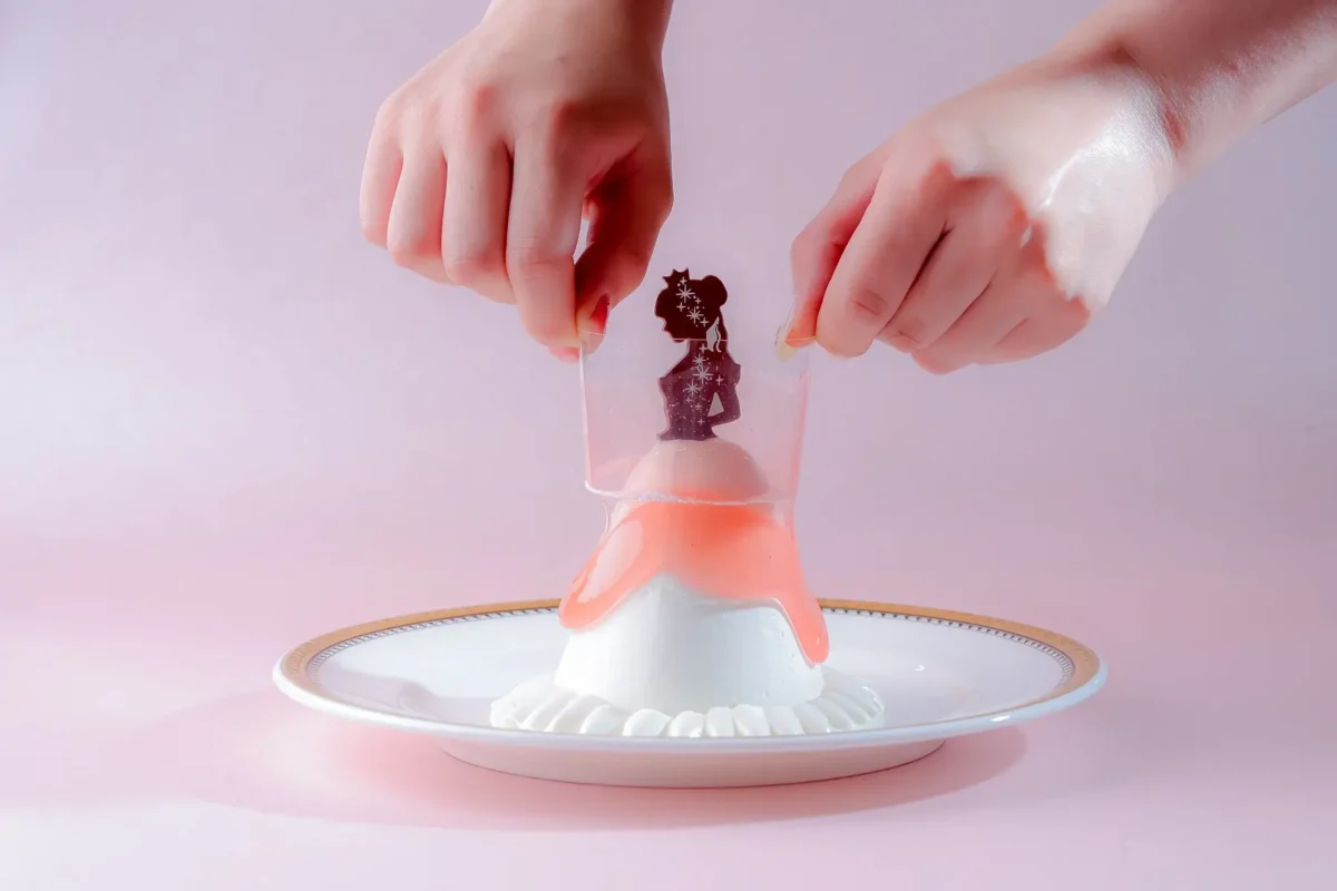 サークル状のシートをドレス型のショートケーキ(ドレス土台)に被せ、シート内にベリーソースを流し込み、プリンセスのチョコレートトップを中央に置きます。
