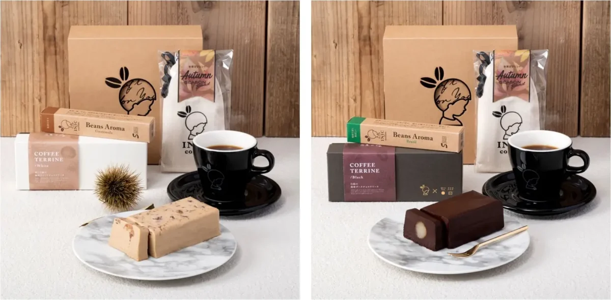 秋の風物詩である栗をふんだんに使用した今秋だけの限定商品「栗と白餡の珈琲ホワイトチョコテリーヌ」と、5月発売時に大好評であった濃厚感がありビターチョコとコーヒーのほろ苦い味わいが人気の「白餡の珈琲ダークチョコテリーヌ」の2種類で発売いたします。単品、テリーヌとコーヒーのセットをご用意しました。公式オンラインストア限定で予約受付中です。10月1日「国際コーヒーの日※」のお届け予定となっております。