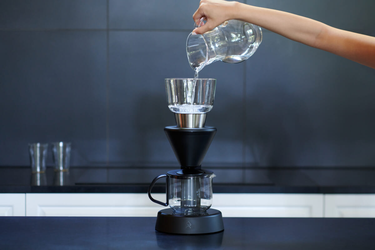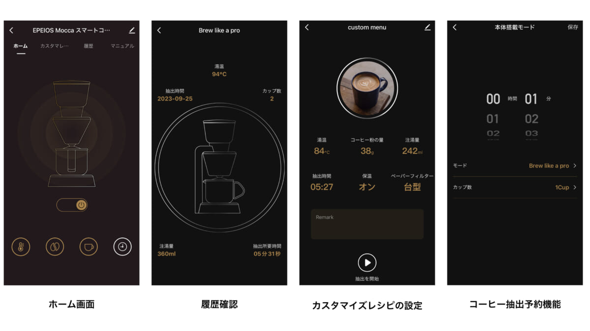 専⽤アプリ「EPEIOS Life」を活⽤することで、お湯の温度を2℃単位、湯量を10ml単位と細かく設定することができます。それにより、コーヒー粉の種類によって抽出⽅法をきめ細やかに設定することができ、⾃分だけのマイレシピを登録すると、次回から登録したレシピを本体に送信することができ、いつでも美味しいコーヒーを堪能いただけます。EPEIOSが⽬指す、それぞれの好みやライフスタイルに合わせられる便利でパーソナルな使⽤となっている。
