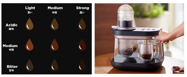 風味と濃さの選択キーを押すだけで「Siphonysta」が抽出過程の温度や時間、かくはん方法を自動調整。その時の気分に合わせたお好みの味をお届けします。