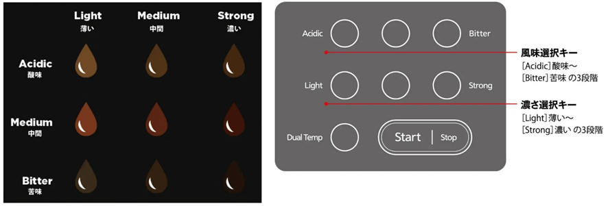 ③同じ豆で9通りの味が楽しめる 風味3段階×濃さ3段階 調整メニュー