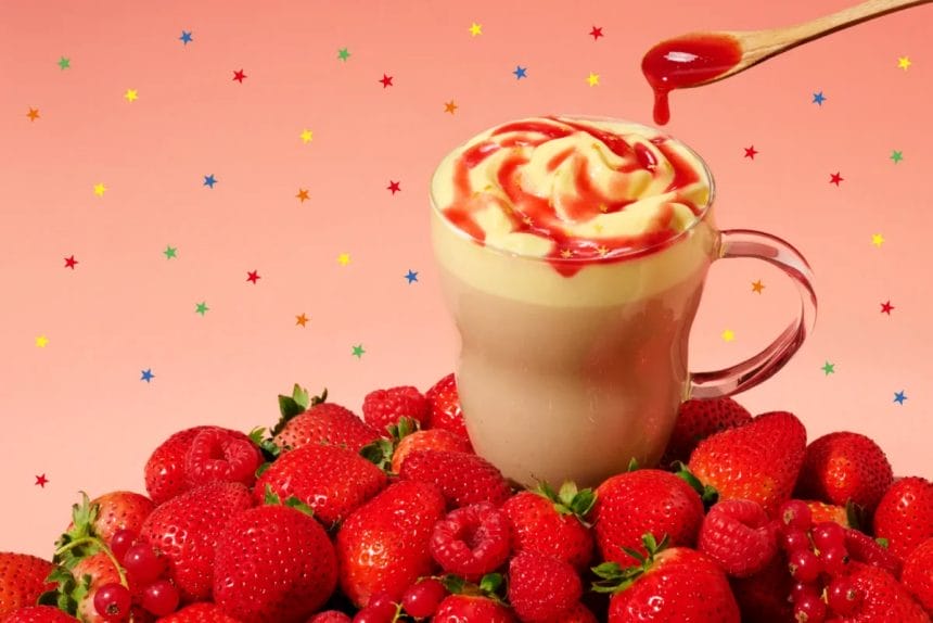 優しい甘さと酸味が特徴の「ベリーBerryカスタードラテ」は、いちご、ラズベリー、赤すぐりを使った自家製ベリーソースとまろやかなミルクを合わせたベリーラテに、たっぷりのカスタードホイップ、追加のベリーソース、キラキラの星のトッピングで仕上げました。ベリーラテ、カスタードホイップ、トッピングのベリーソースを一度に口に含むことで味のコンビネーションを楽しめます。