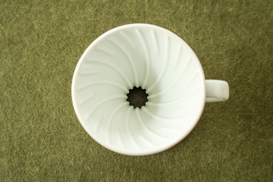 どうせ淹れるなら、おいしいコーヒーを淹れたいところ。「V60透過ドリッパー01セラミックW」は、初心者でもおいしくコーヒーが淹れられる秘密があります。それは、本体内側にある螺旋状のリブ。
