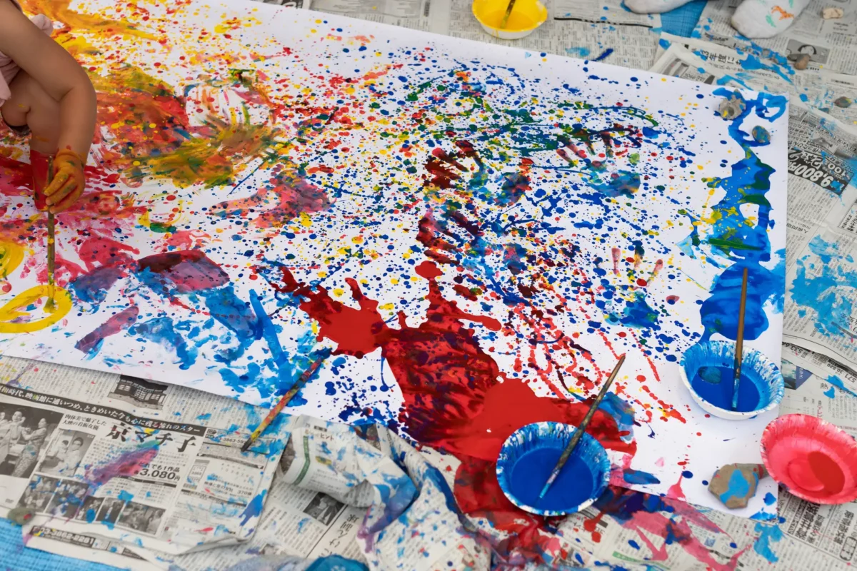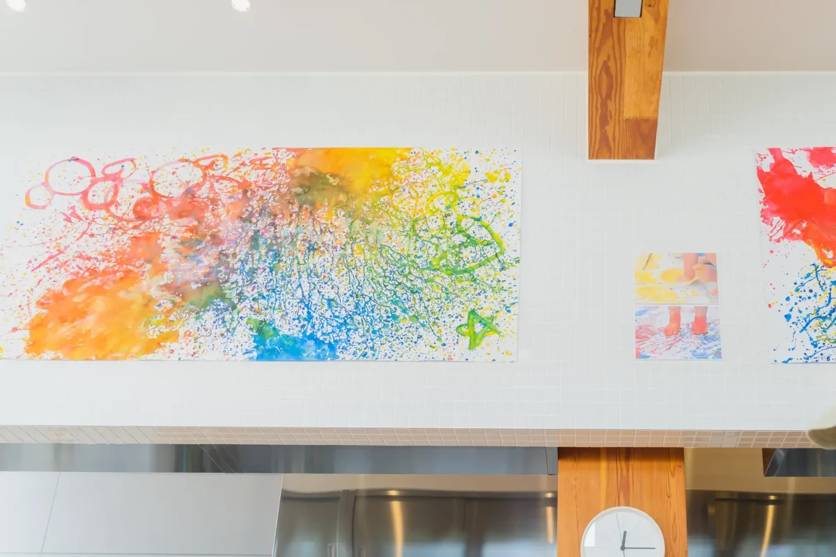 ビシャバシャアートとは、「やわらかアートアカデミー」が主催する子ども向けのフリーペインティングイベント。⼤きなロール画⽤紙を⽤いて⾏うビシャバシャアートは、汚れを気にせずに思いっきりアートが楽しめます。また、イベントで制作した作品は、2024 年1 ⽉頃から⾜⽴区⻄新井にある就労継続⽀援B型カフェ「OUCHI」にて展⽰される予定です。