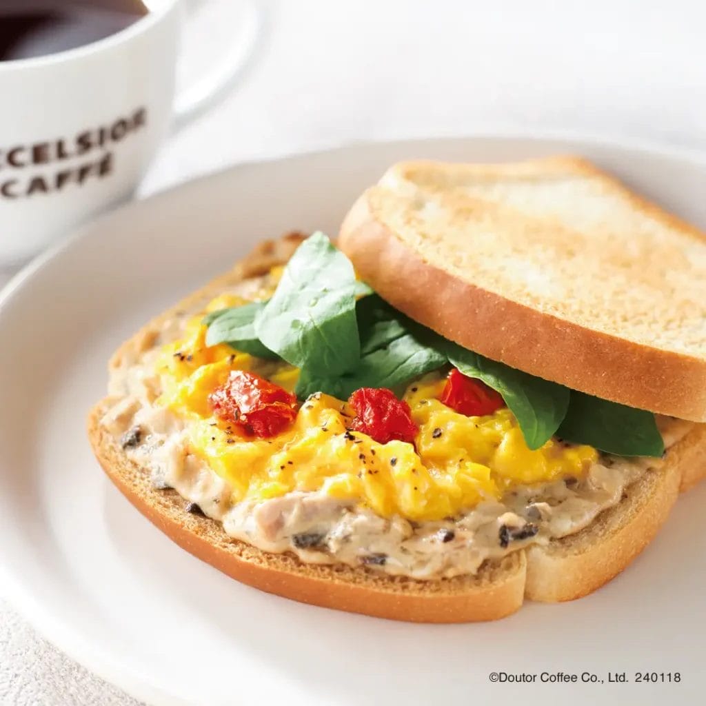 朝食の定番食材「ツナ」と「タマゴ」を使ったモーニング限定のサンドです。オリーブなどが入ったタプナードソースで和えたツナに、スクランブルエッグをのせ、ふわとろ食感とボリューム感をプラス。その上にドライトマトのオイル漬け、サラダほうれん草をトッピングし彩り豊かに仕上げました。ドライトマトのオイル漬けの凝縮した旨味とほどよい酸味が味のアクセントになっています。それぞれの味わいが重なった、風味豊かなサンドイッチです。