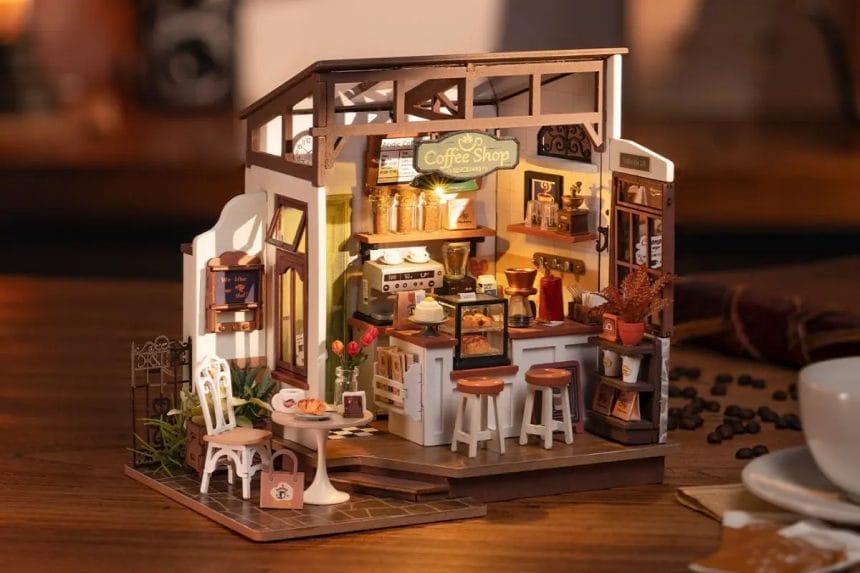 全体的にシックなカラーでまとめられた『カフェテラス』は、開放的なテラス席が特徴的です。本格的なコーヒーマシンやミル、ショーケースに並べられたスイーツなど、可愛らしい小物が揃っています。完成後は、お気に入りの人形やフィギュアと一緒に撮影するのもおすすめです。