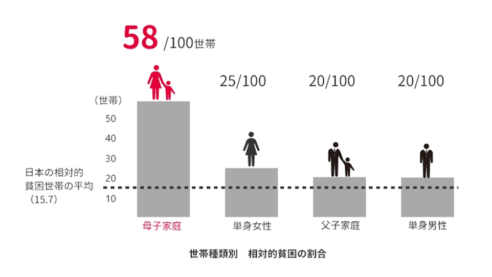 つまり日本人口の6人に1人、約2,000万人が貧困ライン以下での生活を余儀なくされているのです。特に母子家庭をめぐる状況は厳しく、約2世帯に1世帯が相対的貧困状態にあると言われています。