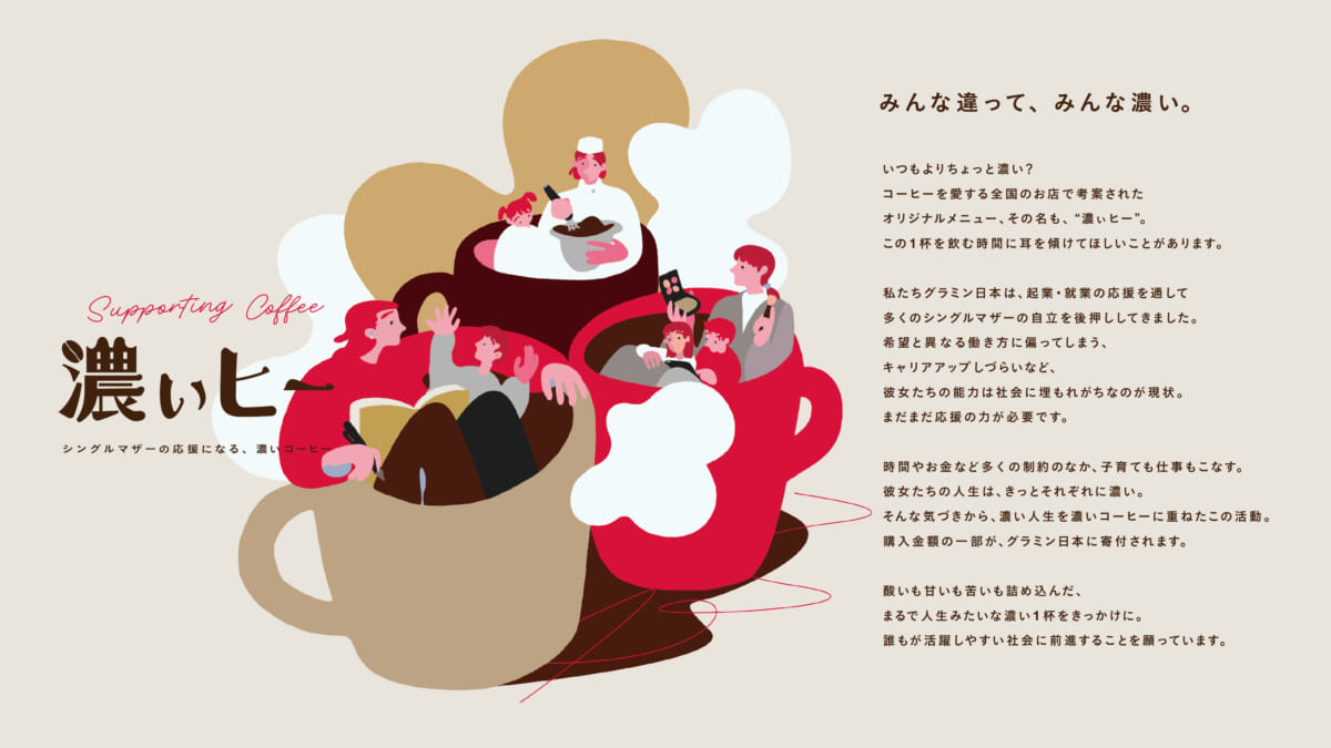「濃ぃヒー」は、購入金額の一部が、シングルマザーへの応援としてグラミン日本に寄付されるチャリティ活動です。シングルマザーの人生を、「大変そうな人生」ではなく「それぞれに濃い人生」と考えてみる。その意識の転換をきっかけに、「かわいそうだから支援する」ではなく、「チャレンジする人を応援する」というポジティブな形に寄付のあり方まで変革したいと考えました。誰もが活躍しやすい社会のために、この濃い1杯をきっかけに応援の輪が広がることを願っています。