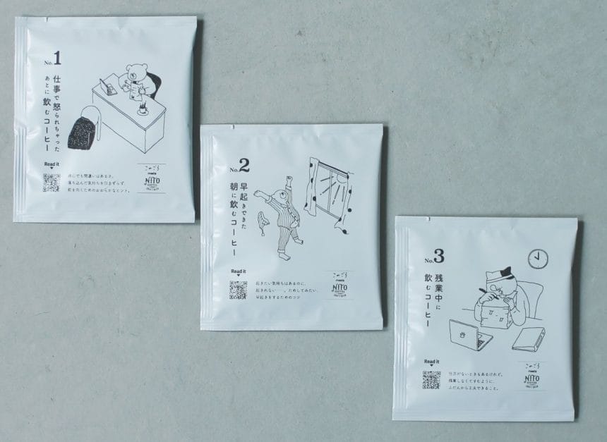 イラストレーターyuichiさん描きおろしの、ヒト化された動物たちのオリジナルイラストが入ったコーヒーのパッケージは、「仕事で怒られちゃったあとに飲むコーヒー」「早起きできた朝に飲むコーヒー」「残業中に飲むコーヒー」の3種類があります。
