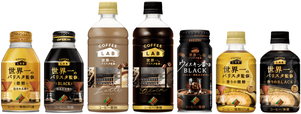 左から「ダイドーブレンド 微糖 コーヒーラボ 世界一のバリスタ監修」「ダイドーブレンド ブラック コーヒーラボ 世界一のバリスタ監修」「ダイドーブレンド ラテ コーヒーラボ 世界一のバリスタ監修」「ダイドーブレンド ブラック コーヒーラボ 世界一のバリスタ監修」「ダイドーブレンド ウイスキー香るブラック コーヒーラボ 世界一のバリスタ監修」「ダイドーブレンド 香りの微糖 コーヒーラボ 世界一のバリスタ監修」「ダイドーブレンド 香りのブラック コーヒーラボ 世界一のバリスタ監修」