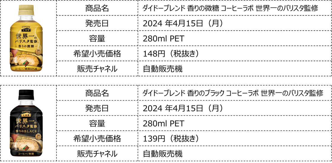 ダイドードリンコ株式会社(本社:大阪市北区、代表取締役社長:中島 孝徳)は、2024年春夏の新商品として、「ダイドーブレンド 香りの微糖 コーヒーラボ 世界一のバリスタ監修」「ダイドーブレンド 香りのブラック コーヒーラボ 世界一のバリスタ監修」を4月15日(月)より発売いたします。
