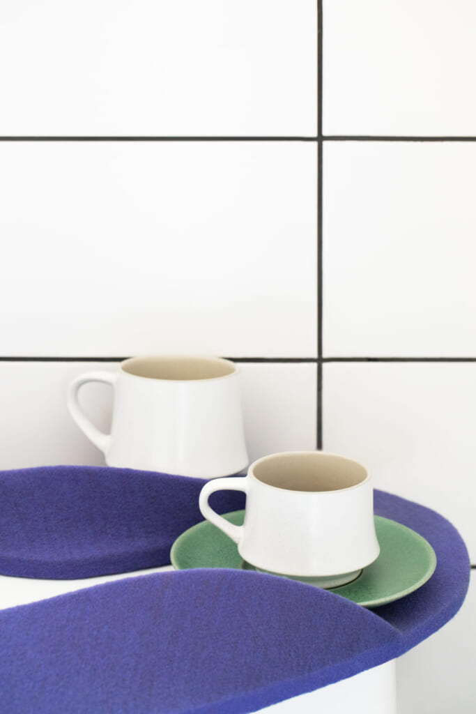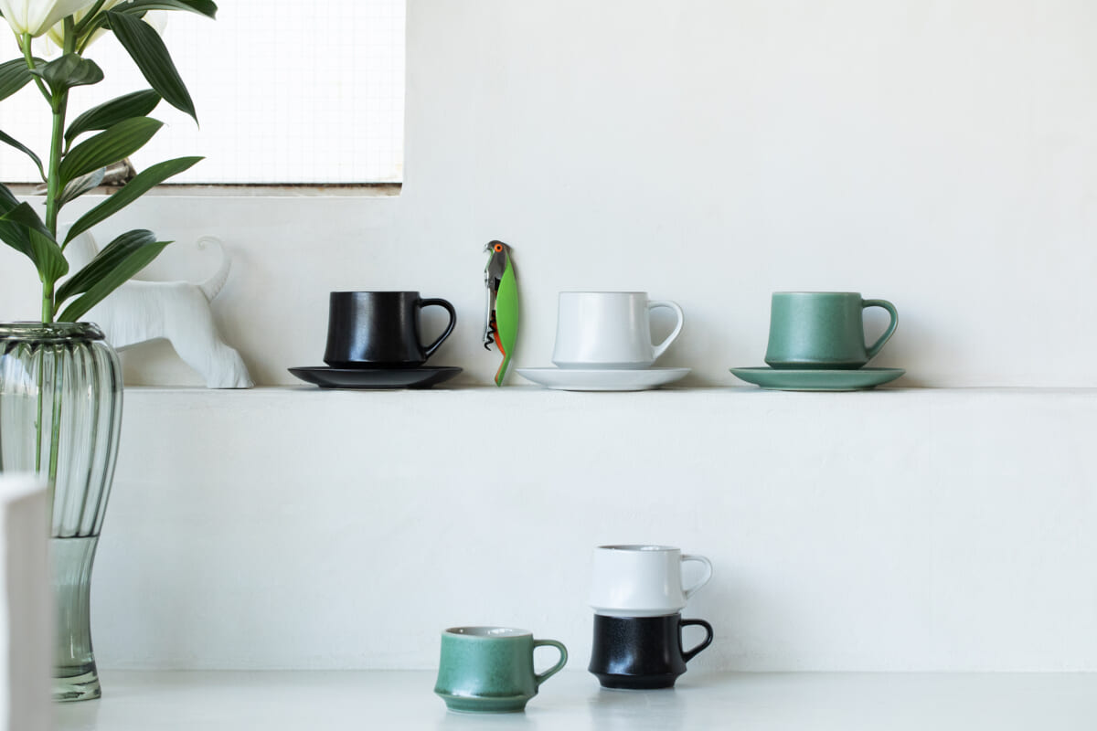 積み重ねて収納することもできるようにカップの径と高台の径を合わせた設計に。また、現代人の手のサイズ感にも合うようにハンドルの形状とサイズも微調整しました。