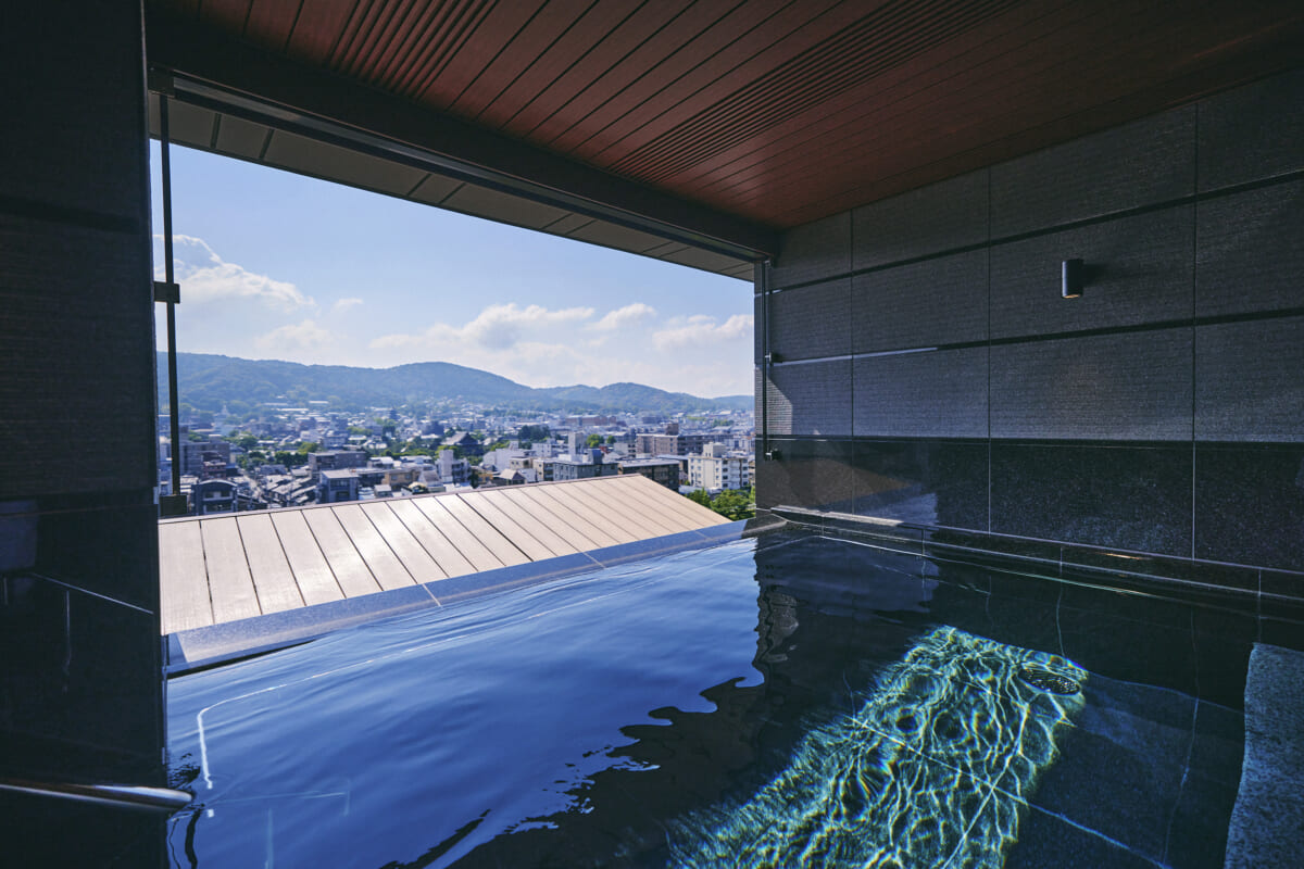 地下1,100mから湧き出る天然温泉を汲み上げた最上階の「天空露天風呂」は、東山の大パノラマを眺望し、1.2mの深場もある「八坂の湯」とやわらかな光に包まれた落ち着いた空間の「庭の湯」の2つの異なるタイプの大浴場を男女入れ替え制でご用意。
