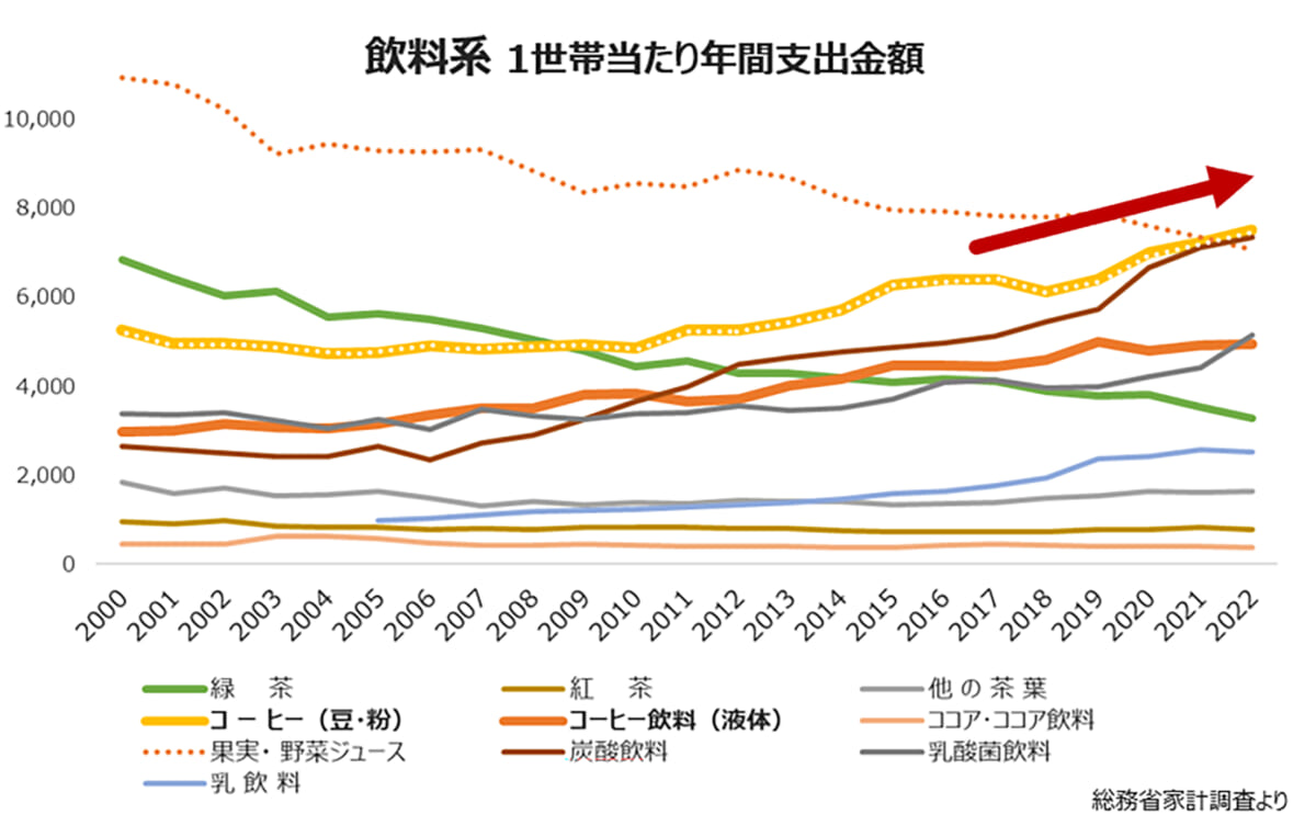 総務省家計調査による飲料系1世帯当たり年間支出金額では緑茶、果実野菜ジュースが年々落ちているのに対し豆や粉末状のコーヒーやコーヒー飲料は年々上昇傾向にあります!