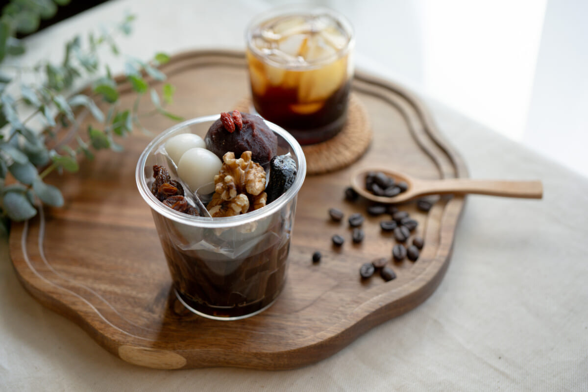 ほろ苦い珈琲寒天に胡桃やレーズン、プルーンを添えた大人なあんみつに仕上げがったそうです。濃厚な甘さの自家製黒蜜をかけてお召し上がりいただくのも和スイーツならではですので、コーヒー好きのお父さんへ贈ってみては~♪