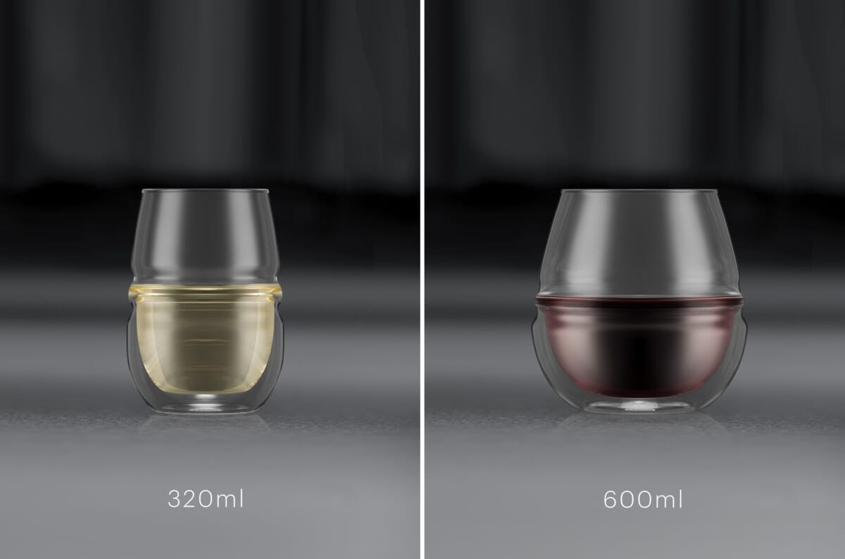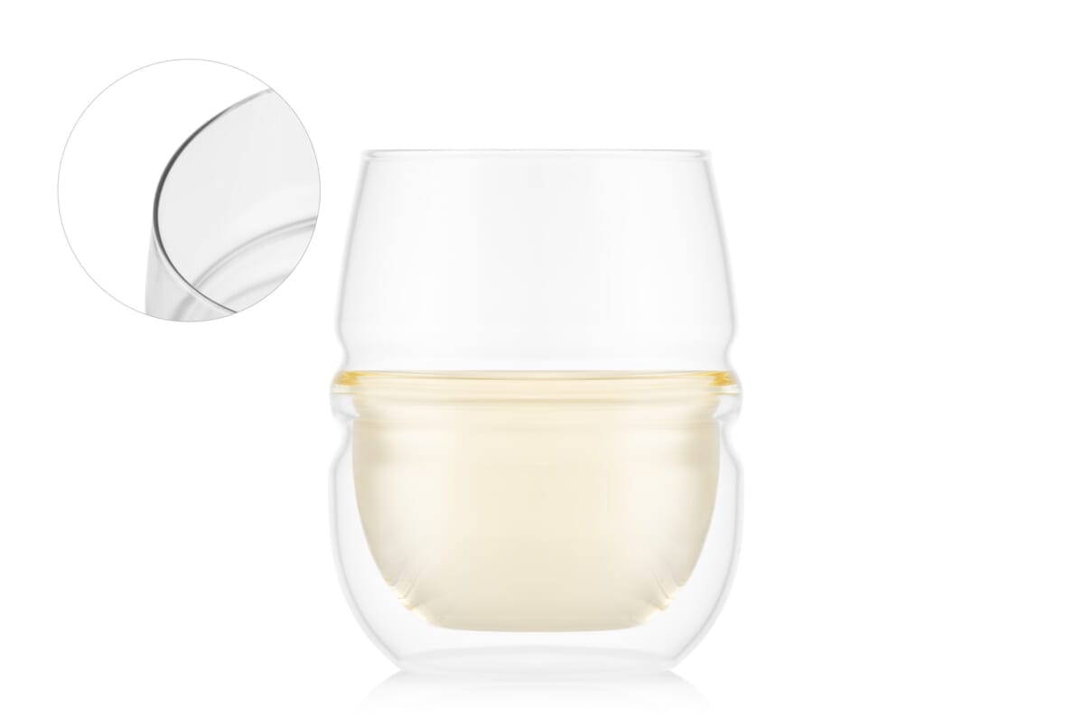 ダブルウォールアロマグラスは、ボウルに丸みを持たせ、リムをすぼめることにより、飲みものの香りをボウル内に閉じ込め長時間滞留させて楽しむことができます。