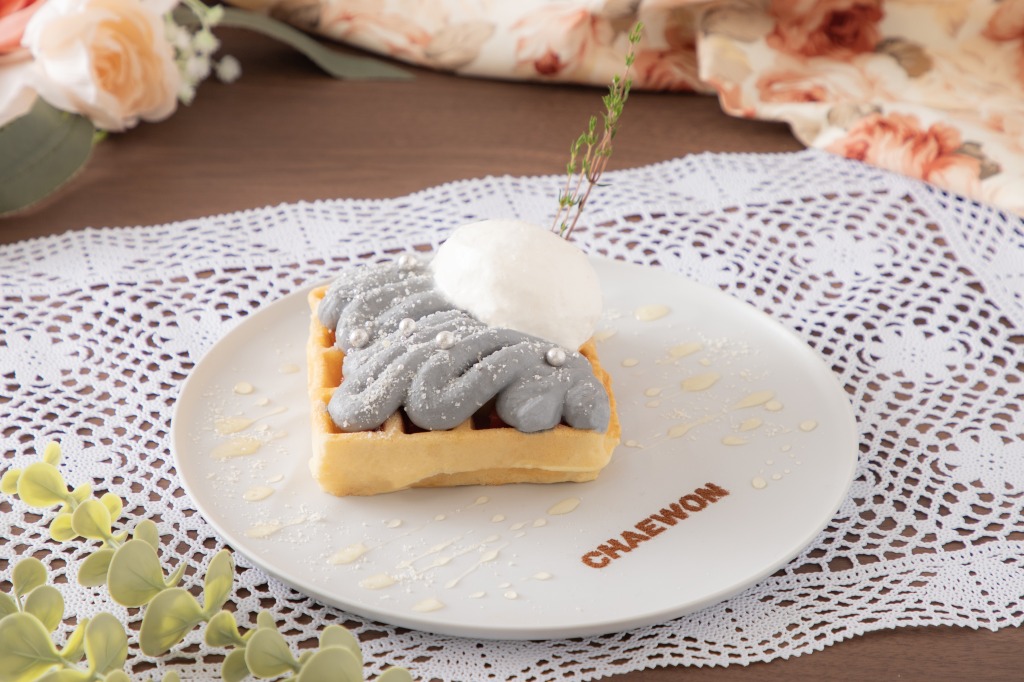 グレープフルーツやストロベリー、チーズクリームなどをトッピングしたワッフル。