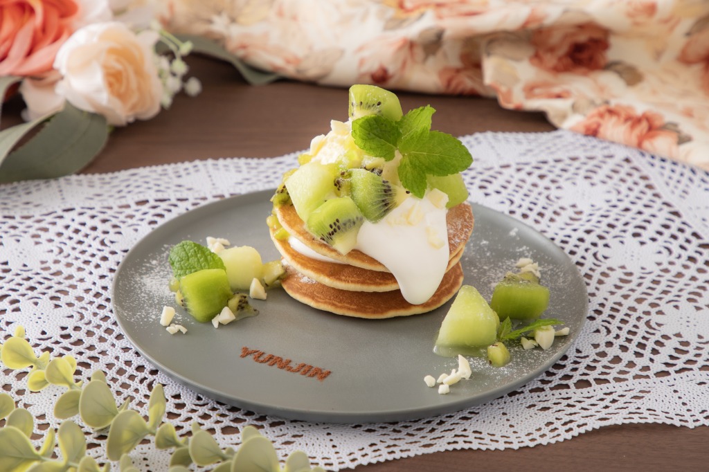 キウイやバニラアイス、ホイップクリームをトッピングしたパンケーキ。